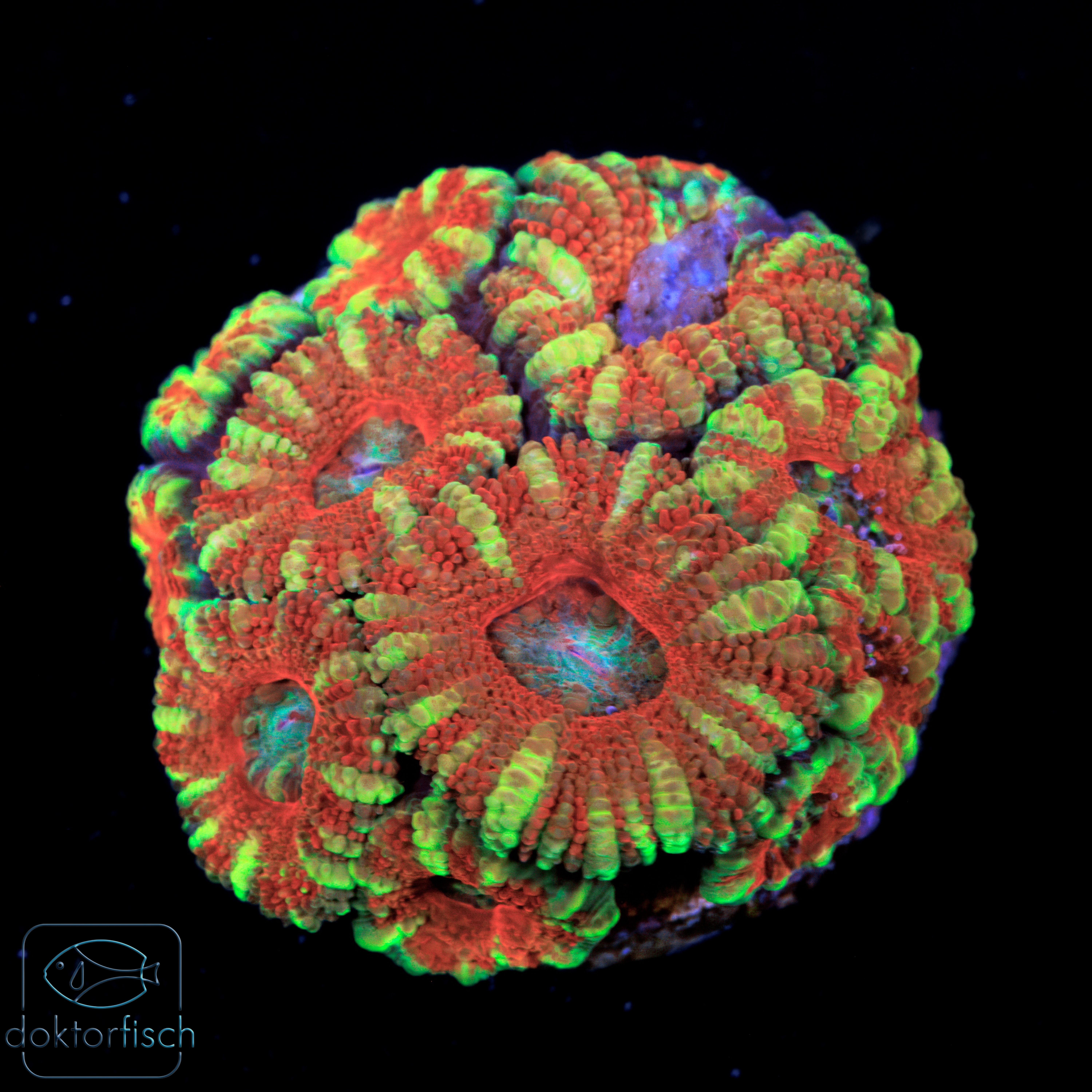 Jeder einzelne Polyp wirkt wie ein kleines Kunstwerk: Das Zentrum zeigt kühle, leicht türkisfarbene Nuancen, während die radial angeordneten Strukturen in sattem Rot erstrahlen. Dazwischen setzen neon-grüne Bereiche starke Kontraste, die unter Blaulicht förmlich aufglühen. Dadurch entsteht eine außergewöhnliche Tiefenwirkung, die dem gesamten Ableger eine plastische, fast dreidimensionale Optik verleiht.