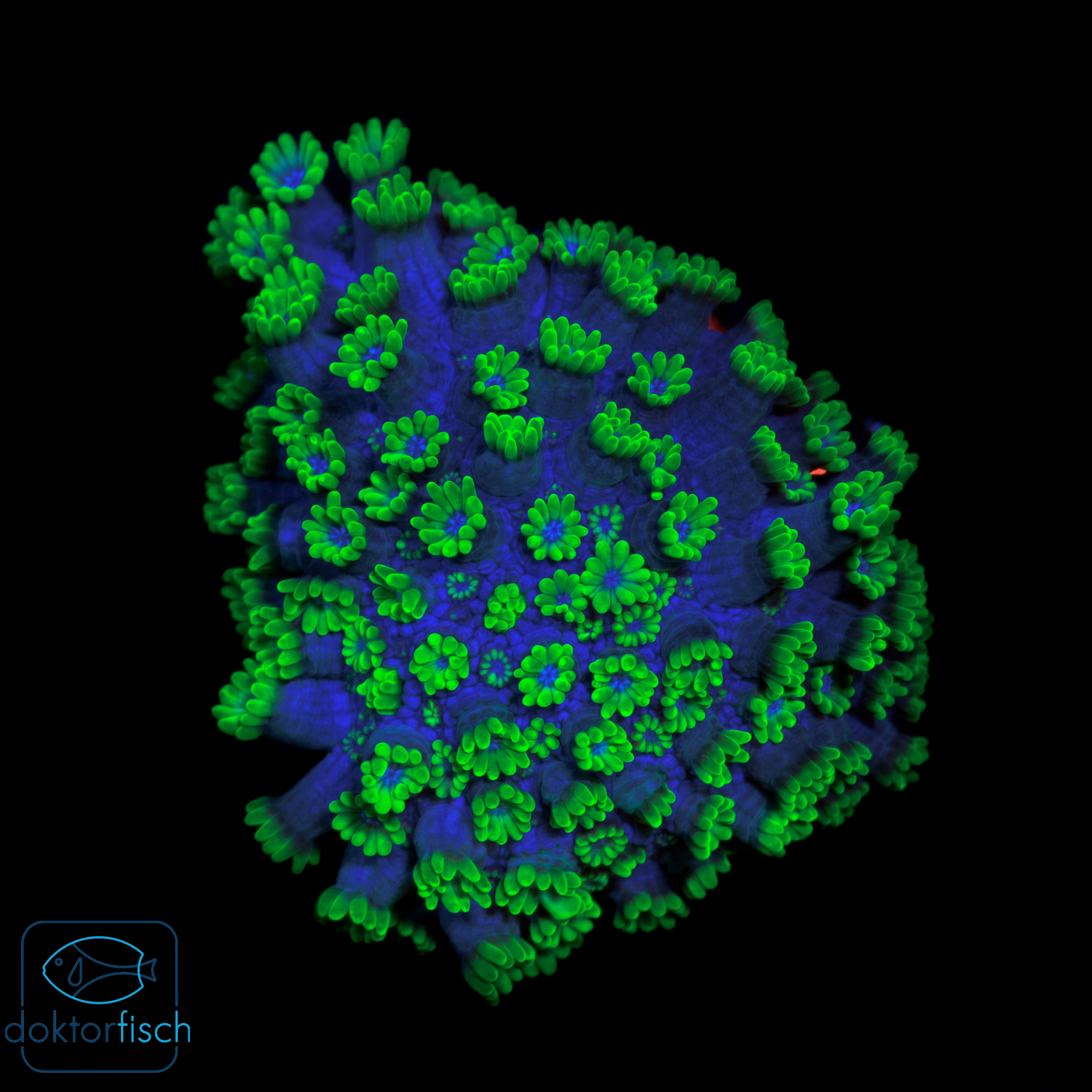 Die Alveopora Green Blue mouth ist eine ganz außergewöhnlich elegante Steinkoralle. Ihre leuchtend grünen Polypen mit blauen Mund sind einfach hinreißend. Ihre langen, fein verzweigten Tentakel bewegen sich ganz sanft in der Strömung und verleihen dem Aquarium eine lebendige, fast blütenartige Optik. Im Vergleich zu Goniopora gilt Alveopora als etwas robuster und pflegeleichter, wodurch sie auch für Aquarianer mit etwas Erfahrung gut geeignet ist. Wenn die Wasserwerte stimmen und sie genug Nährstoffe hat, dann sieht man richtig toll die Polypenexpansion und das Wachstum ist auch gesund.