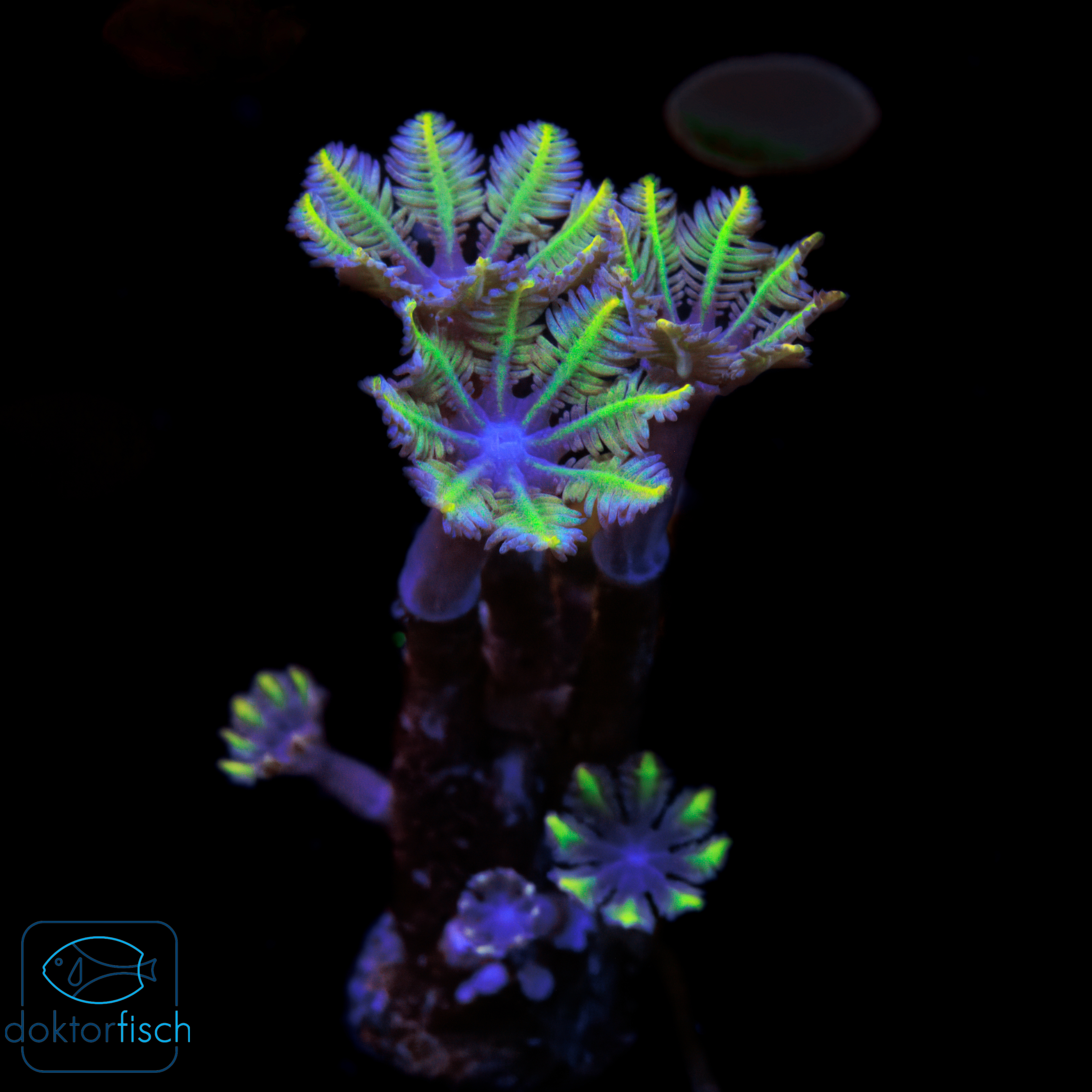 Die Clavularia Gelb ist eine attraktive und pflegeleichte Weichkoralle, die durch ihre leuchtend gelben bis gelb-grünen Polypen sofort ins Auge fällt. Ihre feinen, sternförmigen Polypen öffnen sich tagsüber weit und bewegen sich elegant in der Strömung. So verleihen sie dem Aquarium eine lebendige und natürliche Riffoptik. Die Clavularia wächst wie ein Teppich über Steine und Riffaufbauten und ist eine tolle Pflanze, um freie Flächen zu begrünen. Weil sie so schnell wächst, sollte man ihr genug Platz einräumen, sonst kann sie benachbarte Korallen überwachsen. Sie ist sehr robust und daher perfekt für Einsteiger und erfahrene Meerwasseraquarianer.