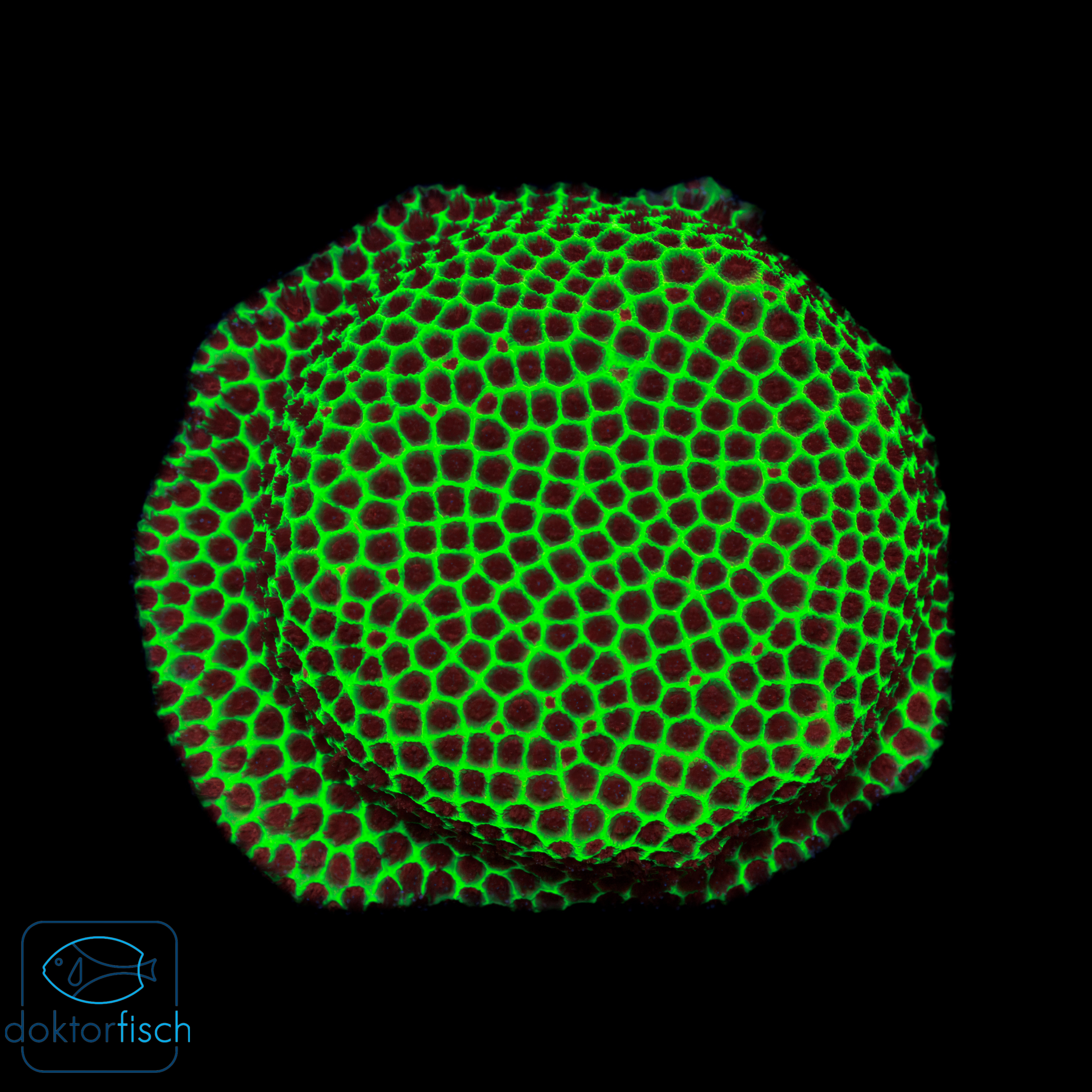 Unter aktinischer Beleuchtung entfaltet sie jedoch ihr volles Potenzial: Das Grün beginnt intensiv zu fluoreszieren, während die Polypen wie feine, schimmernde Akzente auf der Oberfläche wirken. Dadurch entsteht eine faszinierende Tiefenwirkung, die dem Riffaufbau zusätzliche Struktur und visuelle Spannung verleiht. Gleichzeitig sorgt die kompakte, enkrustende bis verzweigende Wuchsform für eine stabile und dichte Kolonieentwicklung.