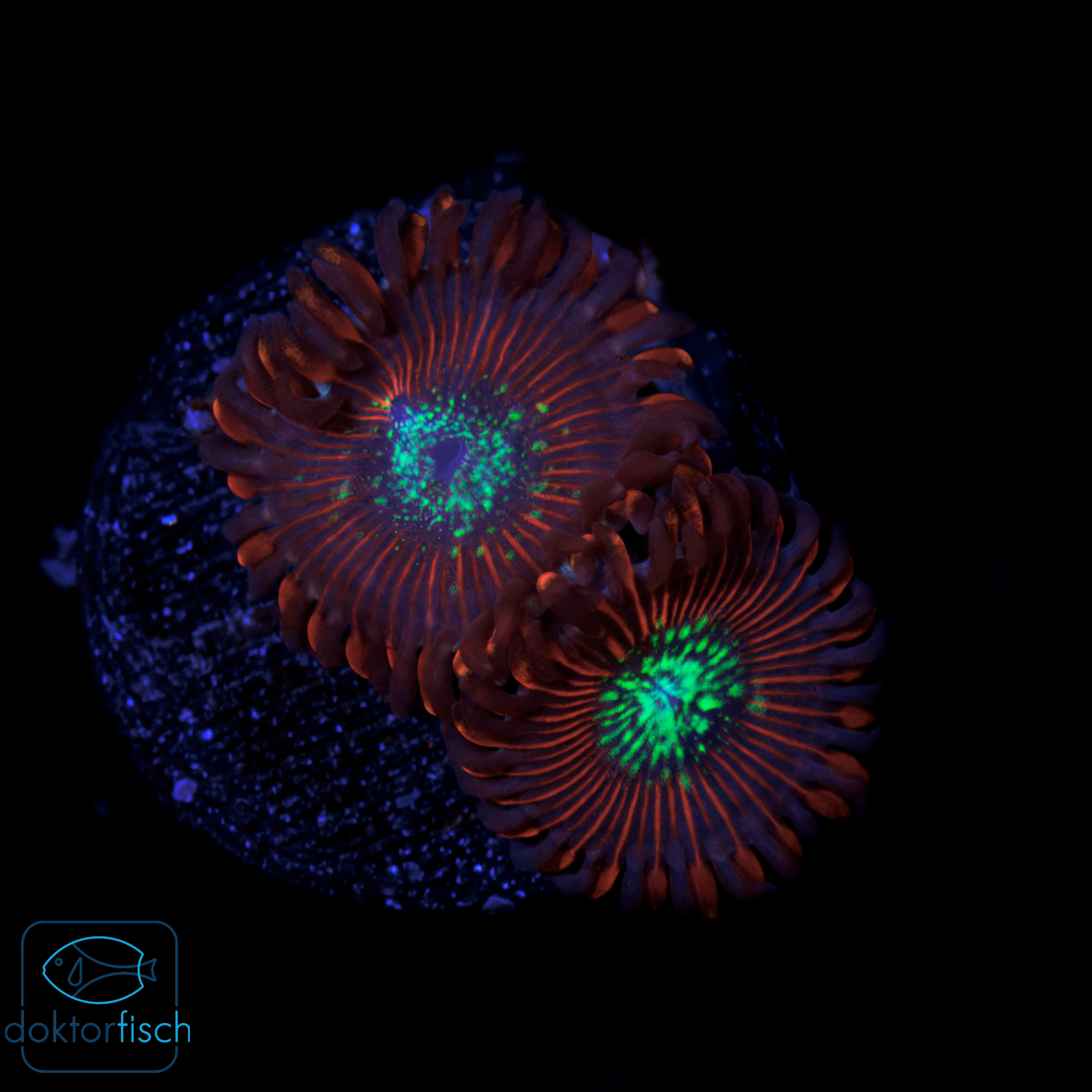 Die Zoanthus Red Magician ist eine äußerst attraktive und farbintensive Krustenanemone. Seine leuchtend roten Polypen werden von einem kontrastreichen, dunkleren Zentrum und einem fein abgestuften Ringmuster ergänzt, was ihm eine magische Tiefenwirkung verleiht. Unter Blaulicht zeigt er besonders kräftige Fluoreszenz und wird so zum echten Blickfang im Riffaquarium. Zoanthus sind pflegeleicht, wachsen zügig und eignen sich sowohl für Einsteiger als auch für erfahrene Aquarianer.